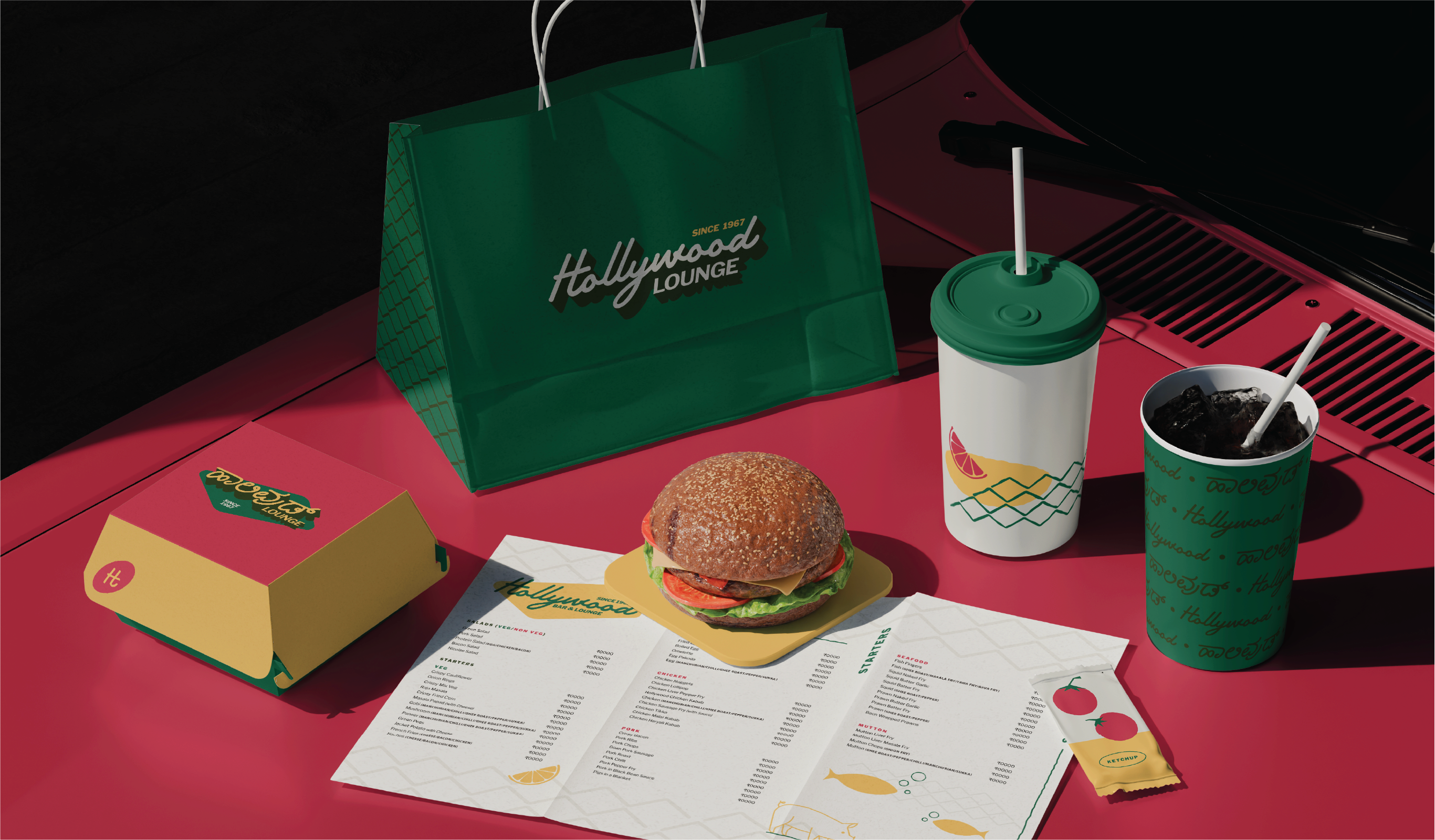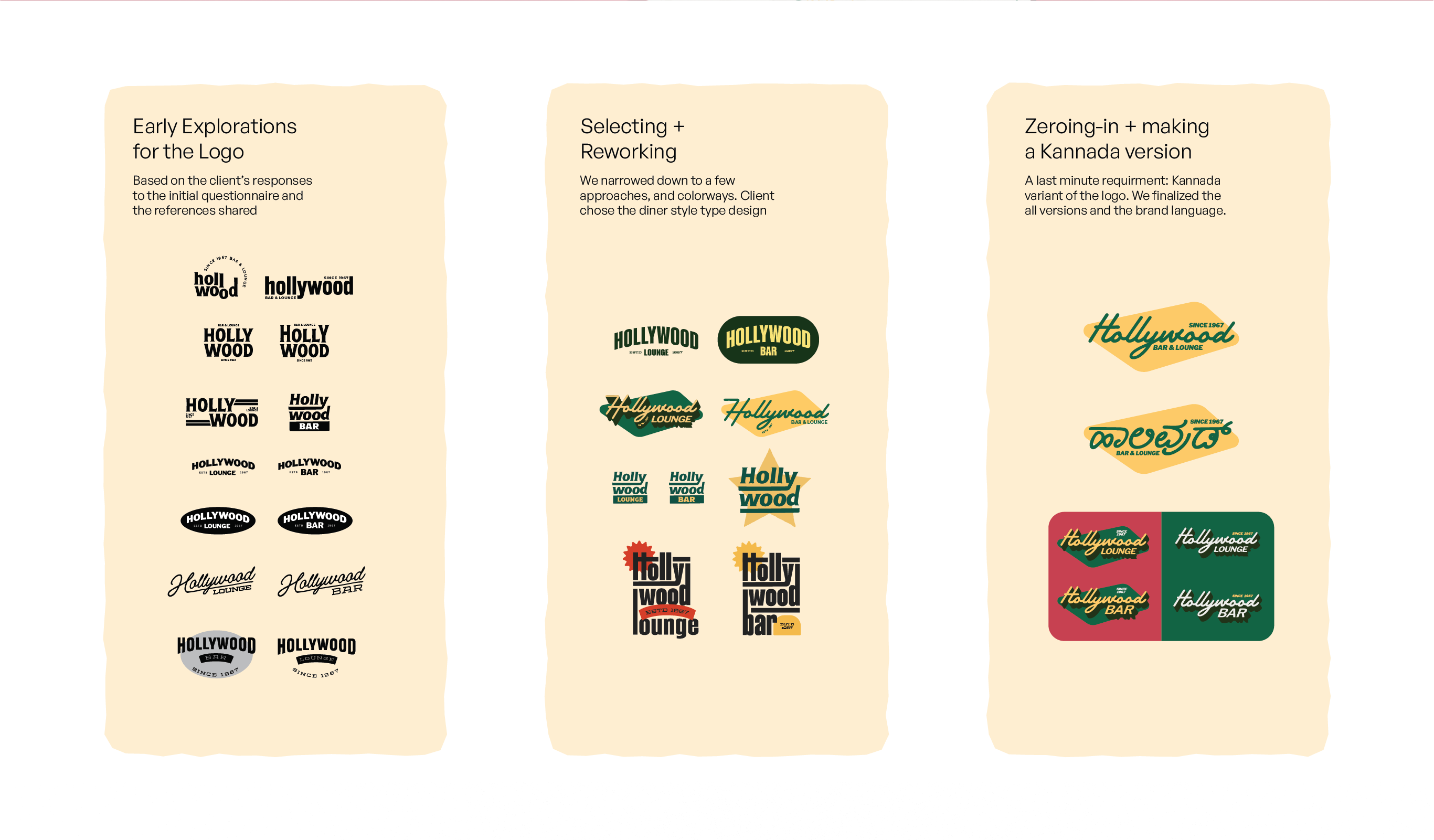 Mangalore's Hollywood Bar has been around since 1964. A growing student population and shifting tastes warranted a brand rethink. So, with their new second location and an updated menu they also required a new identity design. Reminiscent of an American diner, they wanted a warm and inviting visual language that would attract a younger crown while still keeping their old patrons in mind.